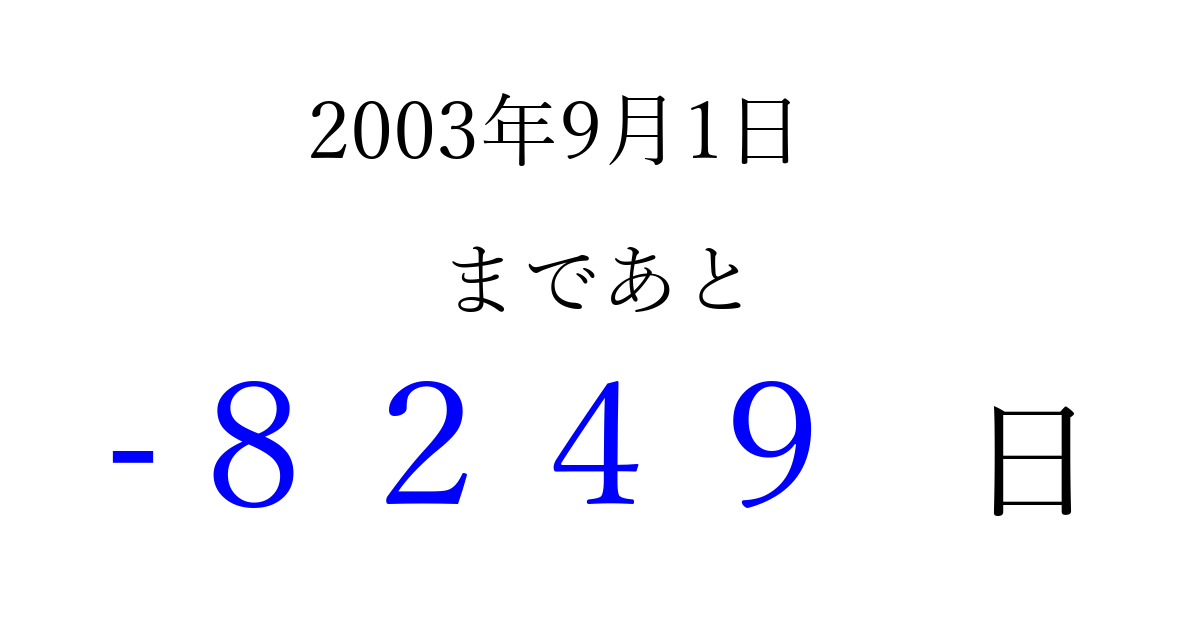 2003年9月1日(月)は もう 0000 日過ぎました 追加すると、トップページからすぐ選べるようになります ※2026/04/02現在の結果です。 最新の状態に更新する ↓シェアして、タイムライン上にカウントダウンを表示しよう!↓ 📤 この結果を共有する Tweet シェア Threads Bluesky 別の日付でカウントダウン 2003年9月のカレンダー このページをブックマークに追加すると、いつでもカウントダウンを確認できます。 (PC: Ctrl+D / Mac: ⌘+D) hitome-notes.comでは以下のページも運営しています。 指定日と期間から日付を計算 | ガチャ確率計算・シミュレーション | プライバシー・ポリシー 運営者:Avocado
