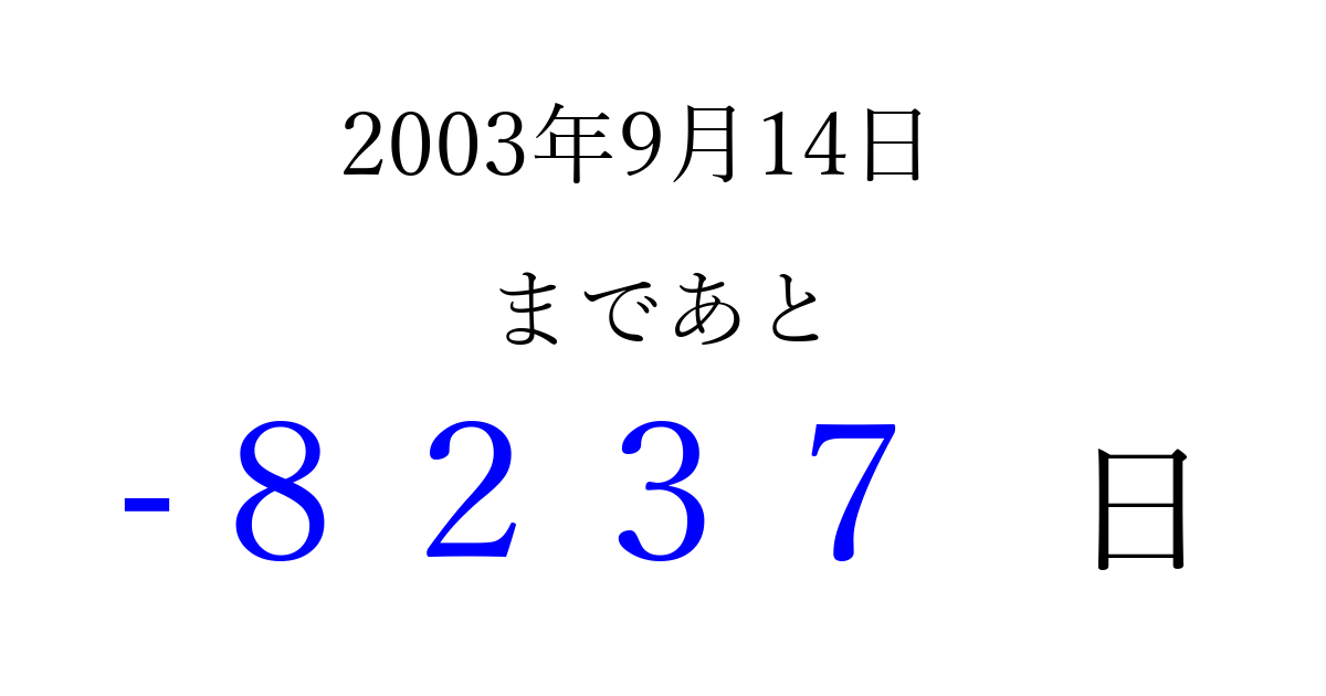 2003年9月14日(日)は もう 0000 日過ぎました 追加すると、トップページからすぐ選べるようになります ※2026/04/03現在の結果です。 最新の状態に更新する ↓シェアして、タイムライン上にカウントダウンを表示しよう!↓ 📤 この結果を共有する Tweet シェア Threads Bluesky 別の日付でカウントダウン 2003年9月のカレンダー このページをブックマークに追加すると、いつでもカウントダウンを確認できます。 (PC: Ctrl+D / Mac: ⌘+D) hitome-notes.comでは以下のページも運営しています。 指定日と期間から日付を計算 | ガチャ確率計算・シミュレーション | プライバシー・ポリシー 運営者:Avocado