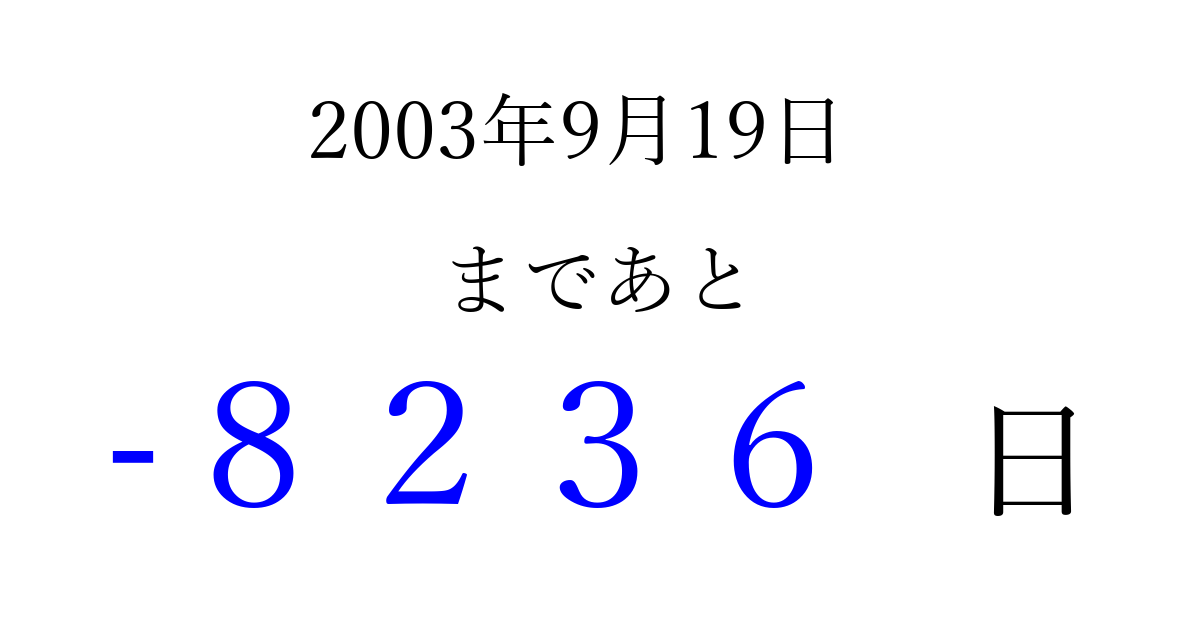 2003年9月19日(金)は もう 0000 日過ぎました 追加すると、トップページからすぐ選べるようになります ※2026/04/07現在の結果です。 最新の状態に更新する ↓シェアして、タイムライン上にカウントダウンを表示しよう!↓ 📤 この結果を共有する Tweet シェア Threads Bluesky 別の日付でカウントダウン 2003年9月のカレンダー このページをブックマークに追加すると、いつでもカウントダウンを確認できます。 (PC: Ctrl+D / Mac: ⌘+D) hitome-notes.comでは以下のページも運営しています。 指定日と期間から日付を計算 | ガチャ確率計算・シミュレーション | プライバシー・ポリシー 運営者:Avocado