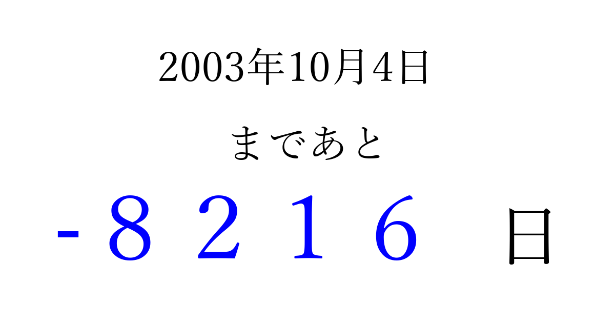 2003年10月4日(土)は もう 0000 日過ぎました 追加すると、トップページからすぐ選べるようになります ※2026/04/02現在の結果です。 最新の状態に更新する ↓シェアして、タイムライン上にカウントダウンを表示しよう!↓ 📤 この結果を共有する Tweet シェア Threads Bluesky 別の日付でカウントダウン 2003年10月のカレンダー このページをブックマークに追加すると、いつでもカウントダウンを確認できます。 (PC: Ctrl+D / Mac: ⌘+D) hitome-notes.comでは以下のページも運営しています。 指定日と期間から日付を計算 | ガチャ確率計算・シミュレーション | プライバシー・ポリシー 運営者:Avocado