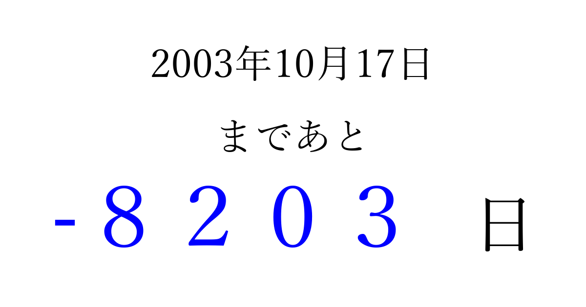 2003年10月17日(金)は もう 0000 日過ぎました 追加すると、トップページからすぐ選べるようになります ※2026/04/02現在の結果です。 最新の状態に更新する ↓シェアして、タイムライン上にカウントダウンを表示しよう!↓ 📤 この結果を共有する Tweet シェア Threads Bluesky 別の日付でカウントダウン 2003年10月のカレンダー このページをブックマークに追加すると、いつでもカウントダウンを確認できます。 (PC: Ctrl+D / Mac: ⌘+D) hitome-notes.comでは以下のページも運営しています。 指定日と期間から日付を計算 | ガチャ確率計算・シミュレーション | プライバシー・ポリシー 運営者:Avocado
