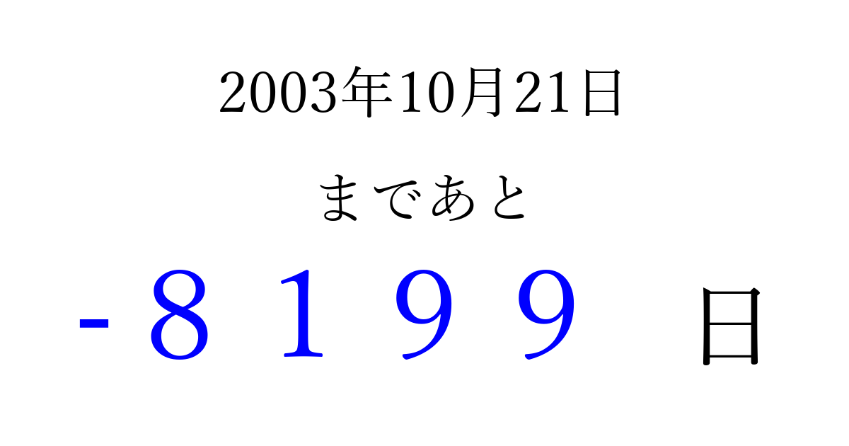 2003年10月21日(火)は もう 0000 日過ぎました 追加すると、トップページからすぐ選べるようになります ※2026/04/02現在の結果です。 最新の状態に更新する ↓シェアして、タイムライン上にカウントダウンを表示しよう!↓ 📤 この結果を共有する Tweet シェア Threads Bluesky 別の日付でカウントダウン 2003年10月のカレンダー このページをブックマークに追加すると、いつでもカウントダウンを確認できます。 (PC: Ctrl+D / Mac: ⌘+D) hitome-notes.comでは以下のページも運営しています。 指定日と期間から日付を計算 | ガチャ確率計算・シミュレーション | プライバシー・ポリシー 運営者:Avocado