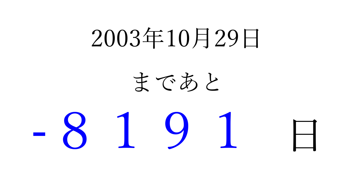 2003年10月29日(水)は もう 0000 日過ぎました 追加すると、トップページからすぐ選べるようになります ※2026/04/02現在の結果です。 最新の状態に更新する ↓シェアして、タイムライン上にカウントダウンを表示しよう!↓ 📤 この結果を共有する Tweet シェア Threads Bluesky 別の日付でカウントダウン 2003年10月のカレンダー このページをブックマークに追加すると、いつでもカウントダウンを確認できます。 (PC: Ctrl+D / Mac: ⌘+D) hitome-notes.comでは以下のページも運営しています。 指定日と期間から日付を計算 | ガチャ確率計算・シミュレーション | プライバシー・ポリシー 運営者:Avocado