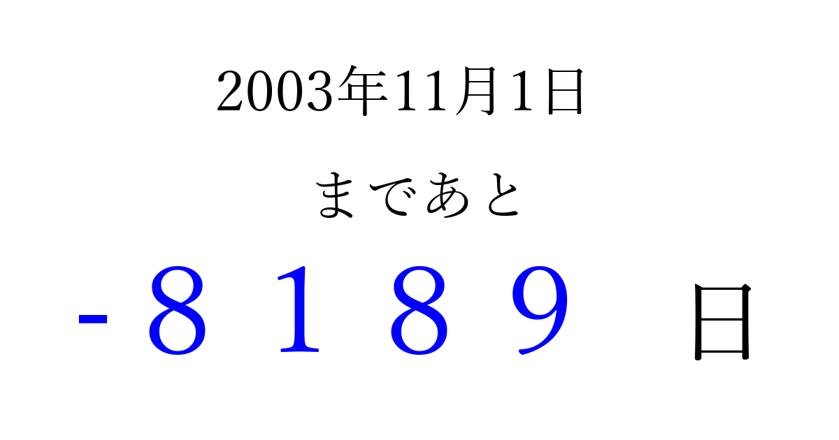 2003年11月1日(土)は もう 0000 日過ぎました 追加すると、トップページからすぐ選べるようになります ※2026/04/03現在の結果です。 最新の状態に更新する ↓シェアして、タイムライン上にカウントダウンを表示しよう!↓ 📤 この結果を共有する Tweet シェア Threads Bluesky 別の日付でカウントダウン 2003年11月のカレンダー このページをブックマークに追加すると、いつでもカウントダウンを確認できます。 (PC: Ctrl+D / Mac: ⌘+D) hitome-notes.comでは以下のページも運営しています。 指定日と期間から日付を計算 | ガチャ確率計算・シミュレーション | プライバシー・ポリシー 運営者:Avocado