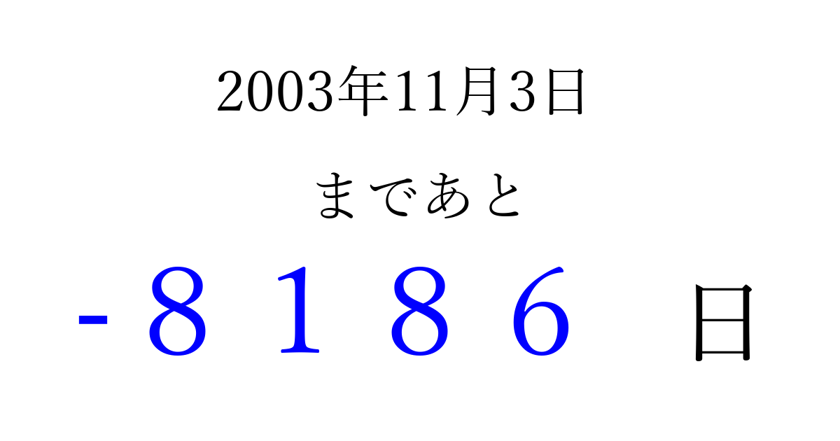 2003年11月3日(月)は もう 0000 日過ぎました 追加すると、トップページからすぐ選べるようになります ※2026/04/02現在の結果です。 最新の状態に更新する ↓シェアして、タイムライン上にカウントダウンを表示しよう!↓ 📤 この結果を共有する Tweet シェア Threads Bluesky 別の日付でカウントダウン 2003年11月のカレンダー このページをブックマークに追加すると、いつでもカウントダウンを確認できます。 (PC: Ctrl+D / Mac: ⌘+D) hitome-notes.comでは以下のページも運営しています。 指定日と期間から日付を計算 | ガチャ確率計算・シミュレーション | プライバシー・ポリシー 運営者:Avocado