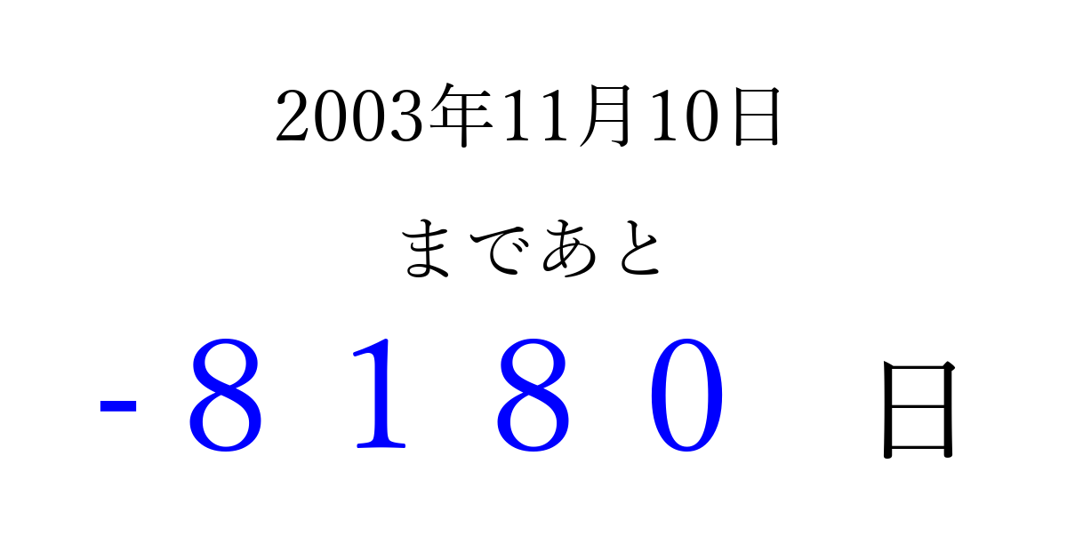 2003年11月10日(月)は もう 0000 日過ぎました 追加すると、トップページからすぐ選べるようになります ※2026/04/03現在の結果です。 最新の状態に更新する ↓シェアして、タイムライン上にカウントダウンを表示しよう!↓ 📤 この結果を共有する Tweet シェア Threads Bluesky 別の日付でカウントダウン 2003年11月のカレンダー このページをブックマークに追加すると、いつでもカウントダウンを確認できます。 (PC: Ctrl+D / Mac: ⌘+D) hitome-notes.comでは以下のページも運営しています。 指定日と期間から日付を計算 | ガチャ確率計算・シミュレーション | プライバシー・ポリシー 運営者:Avocado