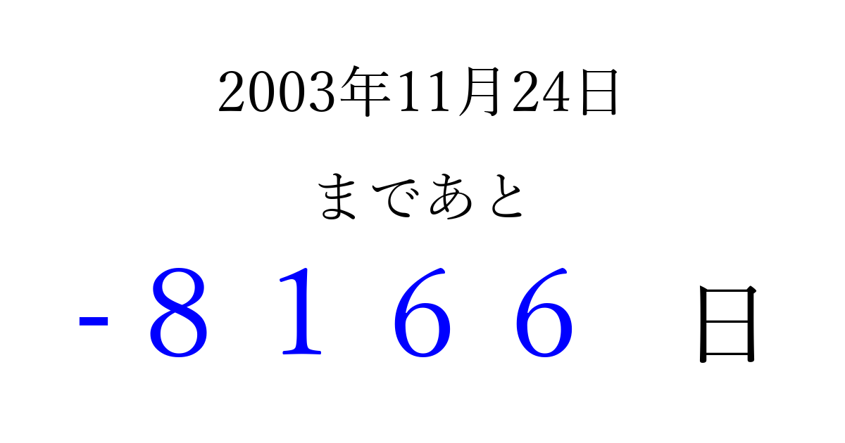 2003年11月24日(月)は もう 0000 日過ぎました 追加すると、トップページからすぐ選べるようになります ※2026/04/03現在の結果です。 最新の状態に更新する ↓シェアして、タイムライン上にカウントダウンを表示しよう!↓ 📤 この結果を共有する Tweet シェア Threads Bluesky 別の日付でカウントダウン 2003年11月のカレンダー このページをブックマークに追加すると、いつでもカウントダウンを確認できます。 (PC: Ctrl+D / Mac: ⌘+D) hitome-notes.comでは以下のページも運営しています。 指定日と期間から日付を計算 | ガチャ確率計算・シミュレーション | プライバシー・ポリシー 運営者:Avocado