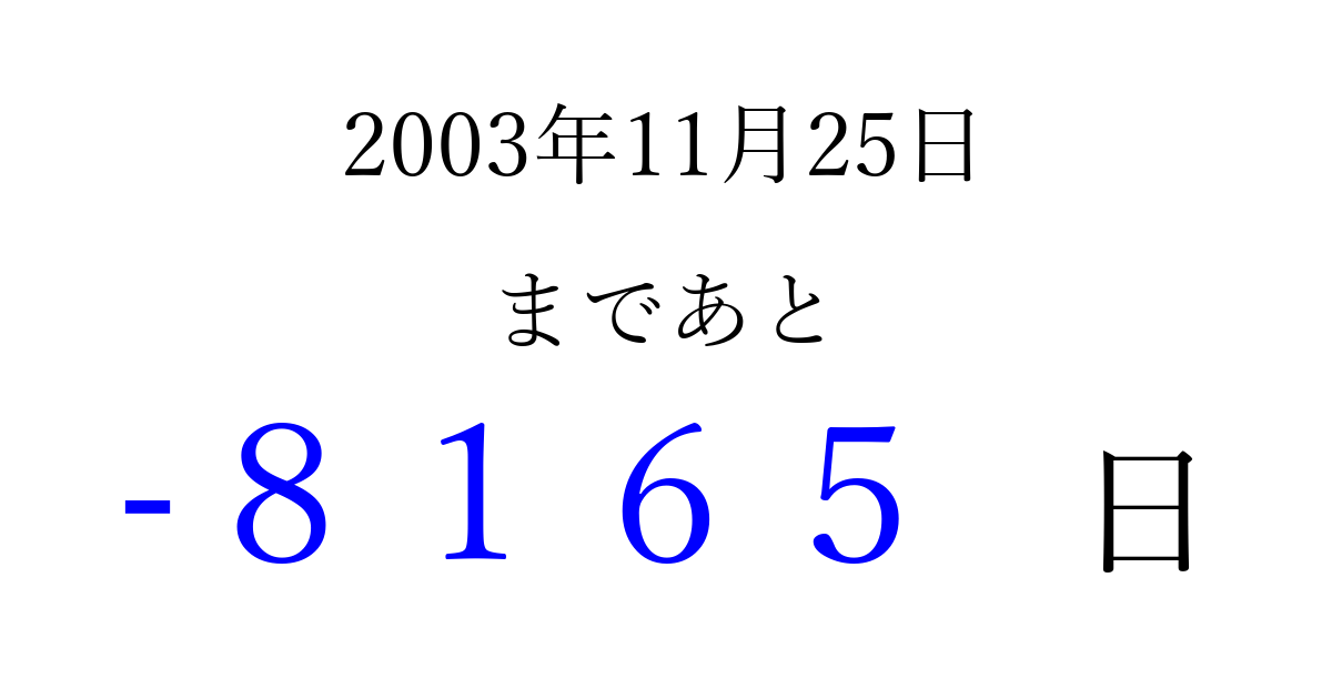 2003年11月25日(火)は もう 0000 日過ぎました 追加すると、トップページからすぐ選べるようになります ※2026/04/03現在の結果です。 最新の状態に更新する ↓シェアして、タイムライン上にカウントダウンを表示しよう!↓ 📤 この結果を共有する Tweet シェア Threads Bluesky 別の日付でカウントダウン 2003年11月のカレンダー このページをブックマークに追加すると、いつでもカウントダウンを確認できます。 (PC: Ctrl+D / Mac: ⌘+D) hitome-notes.comでは以下のページも運営しています。 指定日と期間から日付を計算 | ガチャ確率計算・シミュレーション | プライバシー・ポリシー 運営者:Avocado