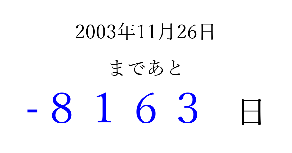 2003年11月26日(水)は もう 0000 日過ぎました 追加すると、トップページからすぐ選べるようになります ※2026/04/02現在の結果です。 最新の状態に更新する ↓シェアして、タイムライン上にカウントダウンを表示しよう!↓ 📤 この結果を共有する Tweet シェア Threads Bluesky 別の日付でカウントダウン 2003年11月のカレンダー このページをブックマークに追加すると、いつでもカウントダウンを確認できます。 (PC: Ctrl+D / Mac: ⌘+D) hitome-notes.comでは以下のページも運営しています。 指定日と期間から日付を計算 | ガチャ確率計算・シミュレーション | プライバシー・ポリシー 運営者:Avocado