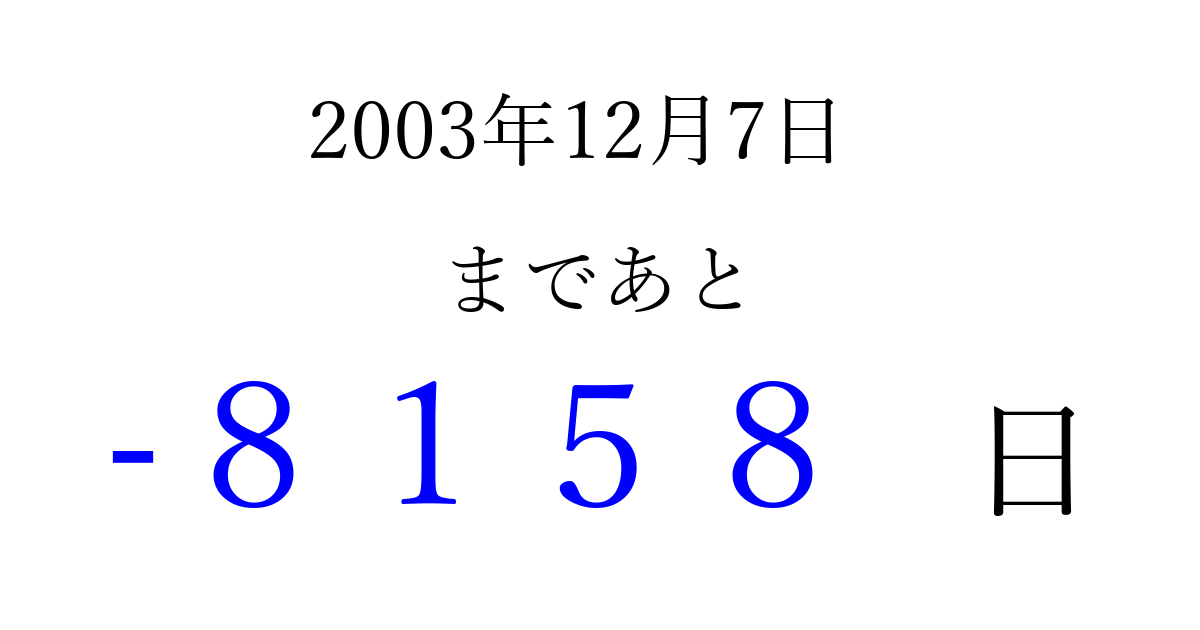 2003年12月7日(日)は もう 0000 日過ぎました 追加すると、トップページからすぐ選べるようになります ※2026/04/08現在の結果です。 最新の状態に更新する ↓シェアして、タイムライン上にカウントダウンを表示しよう!↓ 📤 この結果を共有する Tweet シェア Threads Bluesky 別の日付でカウントダウン 2003年12月のカレンダー このページをブックマークに追加すると、いつでもカウントダウンを確認できます。 (PC: Ctrl+D / Mac: ⌘+D) hitome-notes.comでは以下のページも運営しています。 指定日と期間から日付を計算 | ガチャ確率計算・シミュレーション | プライバシー・ポリシー 運営者:Avocado