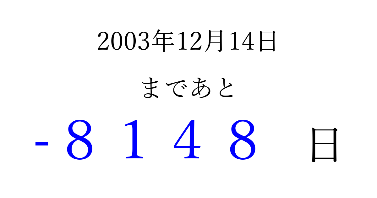2003年12月14日(日)は もう 0000 日過ぎました 追加すると、トップページからすぐ選べるようになります ※2026/04/05現在の結果です。 最新の状態に更新する ↓シェアして、タイムライン上にカウントダウンを表示しよう!↓ 📤 この結果を共有する Tweet シェア Threads Bluesky 別の日付でカウントダウン 2003年12月のカレンダー このページをブックマークに追加すると、いつでもカウントダウンを確認できます。 (PC: Ctrl+D / Mac: ⌘+D) hitome-notes.comでは以下のページも運営しています。 指定日と期間から日付を計算 | ガチャ確率計算・シミュレーション | プライバシー・ポリシー 運営者:Avocado