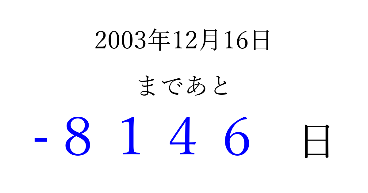 2003年12月16日(火)は もう 0000 日過ぎました 追加すると、トップページからすぐ選べるようになります ※2026/04/05現在の結果です。 最新の状態に更新する ↓シェアして、タイムライン上にカウントダウンを表示しよう!↓ 📤 この結果を共有する Tweet シェア Threads Bluesky 別の日付でカウントダウン 2003年12月のカレンダー このページをブックマークに追加すると、いつでもカウントダウンを確認できます。 (PC: Ctrl+D / Mac: ⌘+D) hitome-notes.comでは以下のページも運営しています。 指定日と期間から日付を計算 | ガチャ確率計算・シミュレーション | プライバシー・ポリシー 運営者:Avocado