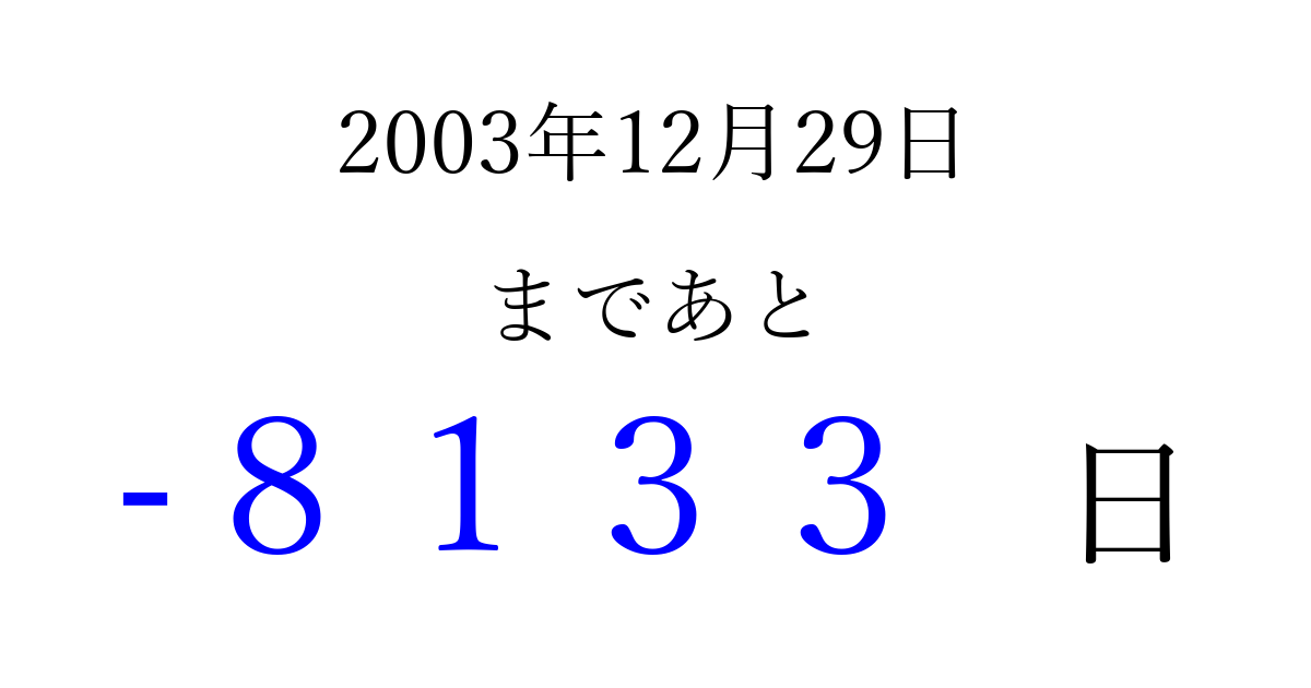 2003年12月29日(月)は もう 0000 日過ぎました 追加すると、トップページからすぐ選べるようになります ※2026/04/05現在の結果です。 最新の状態に更新する ↓シェアして、タイムライン上にカウントダウンを表示しよう!↓ 📤 この結果を共有する Tweet シェア Threads Bluesky 別の日付でカウントダウン 2003年12月のカレンダー このページをブックマークに追加すると、いつでもカウントダウンを確認できます。 (PC: Ctrl+D / Mac: ⌘+D) hitome-notes.comでは以下のページも運営しています。 指定日と期間から日付を計算 | ガチャ確率計算・シミュレーション | プライバシー・ポリシー 運営者:Avocado