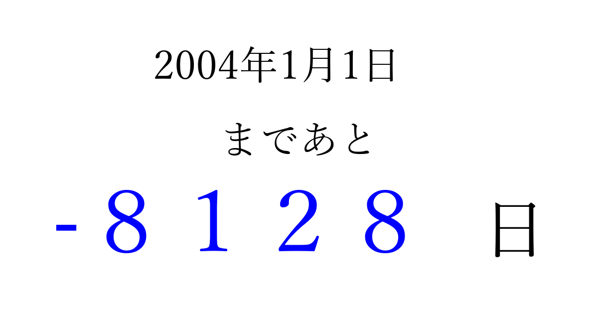 2004年1月1日(木)は もう 0000 日過ぎました 追加すると、トップページからすぐ選べるようになります ※2026/04/03現在の結果です。 最新の状態に更新する ↓シェアして、タイムライン上にカウントダウンを表示しよう!↓ 📤 この結果を共有する Tweet シェア Threads Bluesky 別の日付でカウントダウン 2004年1月のカレンダー このページをブックマークに追加すると、いつでもカウントダウンを確認できます。 (PC: Ctrl+D / Mac: ⌘+D) hitome-notes.comでは以下のページも運営しています。 指定日と期間から日付を計算 | ガチャ確率計算・シミュレーション | プライバシー・ポリシー 運営者:Avocado