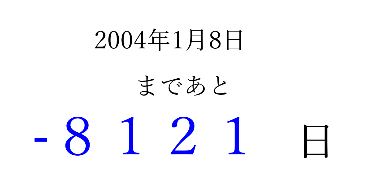 2004年1月8日(木)は もう 0000 日過ぎました 追加すると、トップページからすぐ選べるようになります ※2026/04/03現在の結果です。 最新の状態に更新する ↓シェアして、タイムライン上にカウントダウンを表示しよう!↓ 📤 この結果を共有する Tweet シェア Threads Bluesky 別の日付でカウントダウン 2004年1月のカレンダー このページをブックマークに追加すると、いつでもカウントダウンを確認できます。 (PC: Ctrl+D / Mac: ⌘+D) hitome-notes.comでは以下のページも運営しています。 指定日と期間から日付を計算 | ガチャ確率計算・シミュレーション | プライバシー・ポリシー 運営者:Avocado