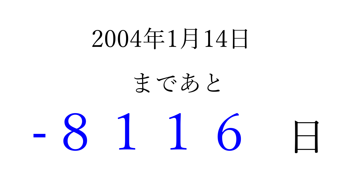 2004年1月14日(水)は もう 0000 日過ぎました 追加すると、トップページからすぐ選べるようになります ※2026/04/04現在の結果です。 最新の状態に更新する ↓シェアして、タイムライン上にカウントダウンを表示しよう!↓ 📤 この結果を共有する Tweet シェア Threads Bluesky 別の日付でカウントダウン 2004年1月のカレンダー このページをブックマークに追加すると、いつでもカウントダウンを確認できます。 (PC: Ctrl+D / Mac: ⌘+D) hitome-notes.comでは以下のページも運営しています。 指定日と期間から日付を計算 | ガチャ確率計算・シミュレーション | プライバシー・ポリシー 運営者:Avocado