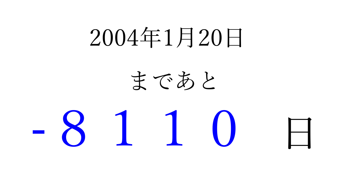 2004年1月20日(火)は もう 0000 日過ぎました 追加すると、トップページからすぐ選べるようになります ※2026/04/04現在の結果です。 最新の状態に更新する ↓シェアして、タイムライン上にカウントダウンを表示しよう!↓ 📤 この結果を共有する Tweet シェア Threads Bluesky 別の日付でカウントダウン 2004年1月のカレンダー このページをブックマークに追加すると、いつでもカウントダウンを確認できます。 (PC: Ctrl+D / Mac: ⌘+D) hitome-notes.comでは以下のページも運営しています。 指定日と期間から日付を計算 | ガチャ確率計算・シミュレーション | プライバシー・ポリシー 運営者:Avocado