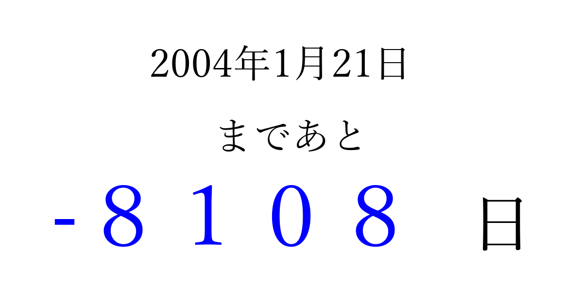2004年1月21日(水)は もう 0000 日過ぎました 追加すると、トップページからすぐ選べるようになります ※2026/04/03現在の結果です。 最新の状態に更新する ↓シェアして、タイムライン上にカウントダウンを表示しよう!↓ 📤 この結果を共有する Tweet シェア Threads Bluesky 別の日付でカウントダウン 2004年1月のカレンダー このページをブックマークに追加すると、いつでもカウントダウンを確認できます。 (PC: Ctrl+D / Mac: ⌘+D) hitome-notes.comでは以下のページも運営しています。 指定日と期間から日付を計算 | ガチャ確率計算・シミュレーション | プライバシー・ポリシー 運営者:Avocado