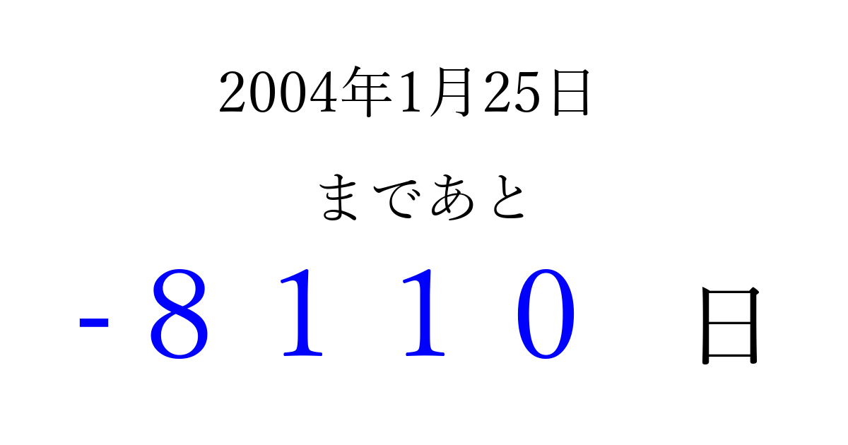 2004年1月25日(日)は もう 0000 日過ぎました 追加すると、トップページからすぐ選べるようになります ※2026/04/09現在の結果です。 最新の状態に更新する ↓シェアして、タイムライン上にカウントダウンを表示しよう!↓ 📤 この結果を共有する Tweet シェア Threads Bluesky 別の日付でカウントダウン 2004年1月のカレンダー このページをブックマークに追加すると、いつでもカウントダウンを確認できます。 (PC: Ctrl+D / Mac: ⌘+D) hitome-notes.comでは以下のページも運営しています。 指定日と期間から日付を計算 | ガチャ確率計算・シミュレーション | プライバシー・ポリシー 運営者:Avocado
