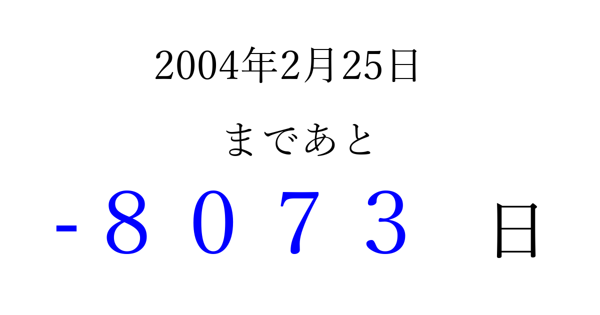 2004年2月25日(水)は もう 0000 日過ぎました 追加すると、トップページからすぐ選べるようになります ※2026/04/03現在の結果です。 最新の状態に更新する ↓シェアして、タイムライン上にカウントダウンを表示しよう!↓ 📤 この結果を共有する Tweet シェア Threads Bluesky 別の日付でカウントダウン 2004年2月のカレンダー このページをブックマークに追加すると、いつでもカウントダウンを確認できます。 (PC: Ctrl+D / Mac: ⌘+D) hitome-notes.comでは以下のページも運営しています。 指定日と期間から日付を計算 | ガチャ確率計算・シミュレーション | プライバシー・ポリシー 運営者:Avocado
