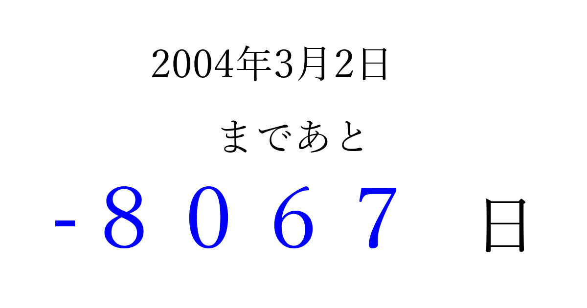 2004年3月2日(火)は もう 0000 日過ぎました 追加すると、トップページからすぐ選べるようになります ※2026/04/03現在の結果です。 最新の状態に更新する ↓シェアして、タイムライン上にカウントダウンを表示しよう!↓ 📤 この結果を共有する Tweet シェア Threads Bluesky 別の日付でカウントダウン 2004年3月のカレンダー このページをブックマークに追加すると、いつでもカウントダウンを確認できます。 (PC: Ctrl+D / Mac: ⌘+D) hitome-notes.comでは以下のページも運営しています。 指定日と期間から日付を計算 | ガチャ確率計算・シミュレーション | プライバシー・ポリシー 運営者:Avocado