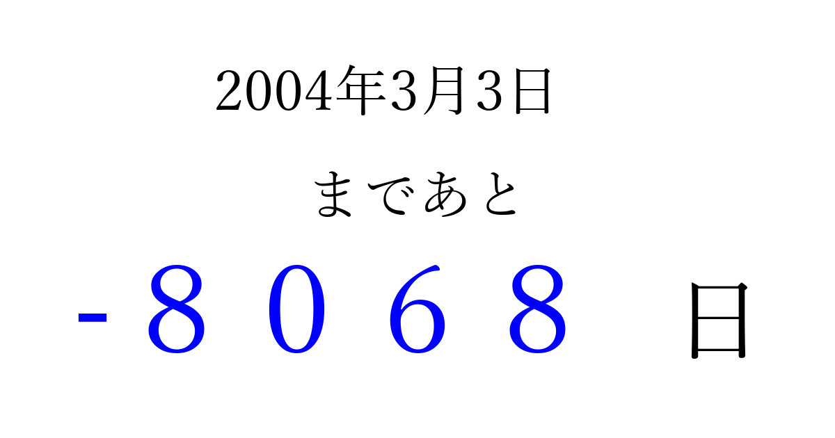 2004年3月3日(水)は もう 0000 日過ぎました 追加すると、トップページからすぐ選べるようになります ※2026/04/05現在の結果です。 最新の状態に更新する ↓シェアして、タイムライン上にカウントダウンを表示しよう!↓ 📤 この結果を共有する Tweet シェア Threads Bluesky 別の日付でカウントダウン 2004年3月のカレンダー このページをブックマークに追加すると、いつでもカウントダウンを確認できます。 (PC: Ctrl+D / Mac: ⌘+D) hitome-notes.comでは以下のページも運営しています。 指定日と期間から日付を計算 | ガチャ確率計算・シミュレーション | プライバシー・ポリシー 運営者:Avocado