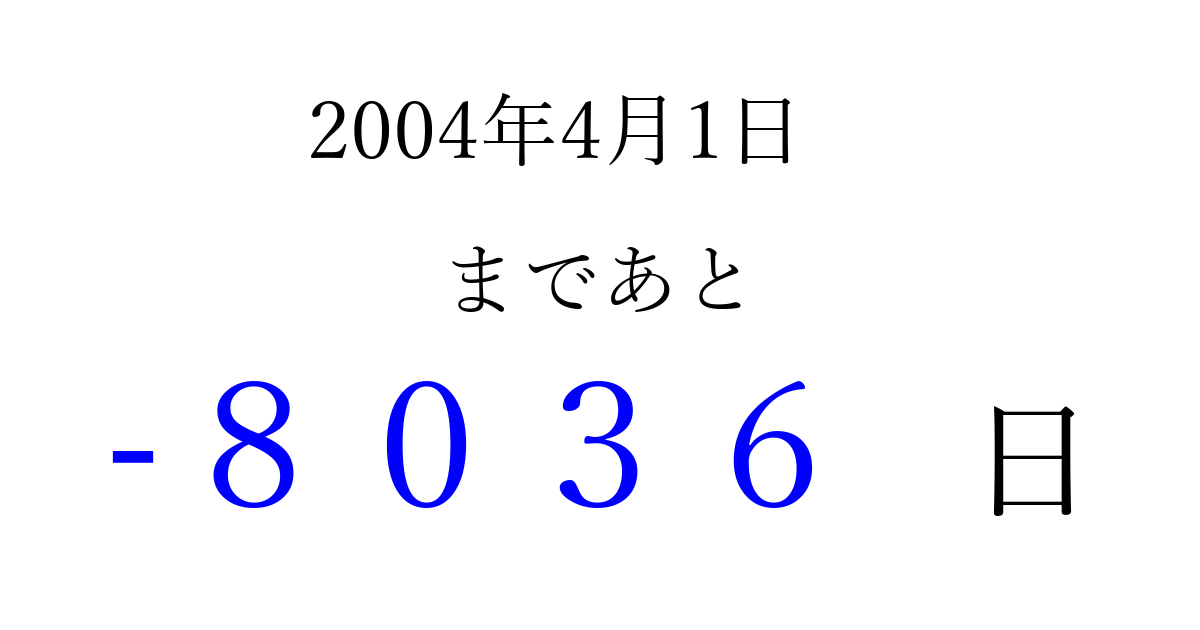 2004年4月1日(木)は もう 0000 日過ぎました 追加すると、トップページからすぐ選べるようになります ※2026/04/02現在の結果です。 最新の状態に更新する ↓シェアして、タイムライン上にカウントダウンを表示しよう!↓ 📤 この結果を共有する Tweet シェア Threads Bluesky 別の日付でカウントダウン 2004年4月のカレンダー このページをブックマークに追加すると、いつでもカウントダウンを確認できます。 (PC: Ctrl+D / Mac: ⌘+D) hitome-notes.comでは以下のページも運営しています。 指定日と期間から日付を計算 | ガチャ確率計算・シミュレーション | プライバシー・ポリシー 運営者:Avocado