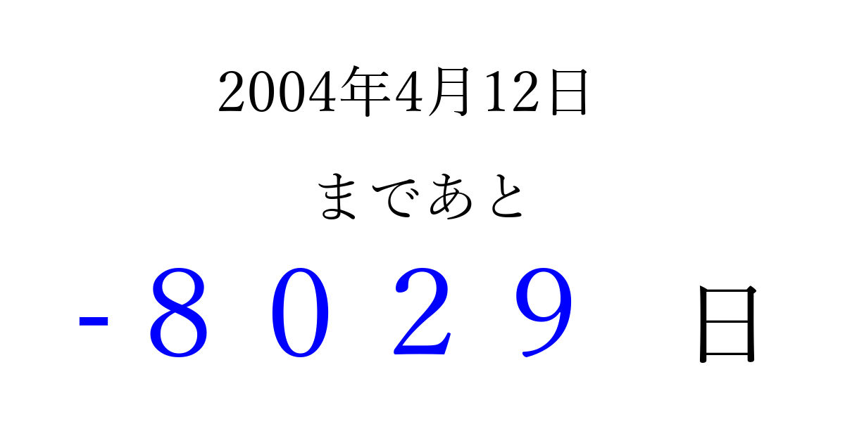 2004年4月12日(月)は もう 0000 日過ぎました 追加すると、トップページからすぐ選べるようになります ※2026/04/06現在の結果です。 最新の状態に更新する ↓シェアして、タイムライン上にカウントダウンを表示しよう!↓ 📤 この結果を共有する Tweet シェア Threads Bluesky 別の日付でカウントダウン 2004年4月のカレンダー このページをブックマークに追加すると、いつでもカウントダウンを確認できます。 (PC: Ctrl+D / Mac: ⌘+D) hitome-notes.comでは以下のページも運営しています。 指定日と期間から日付を計算 | ガチャ確率計算・シミュレーション | プライバシー・ポリシー 運営者:Avocado