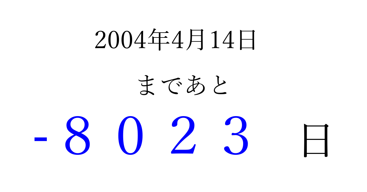 2004年4月14日(水)は もう 0000 日過ぎました 追加すると、トップページからすぐ選べるようになります ※2026/04/02現在の結果です。 最新の状態に更新する ↓シェアして、タイムライン上にカウントダウンを表示しよう!↓ 📤 この結果を共有する Tweet シェア Threads Bluesky 別の日付でカウントダウン 2004年4月のカレンダー このページをブックマークに追加すると、いつでもカウントダウンを確認できます。 (PC: Ctrl+D / Mac: ⌘+D) hitome-notes.comでは以下のページも運営しています。 指定日と期間から日付を計算 | ガチャ確率計算・シミュレーション | プライバシー・ポリシー 運営者:Avocado