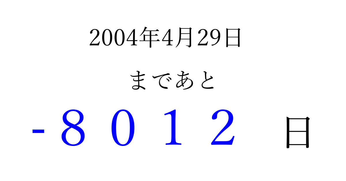 2004年4月29日(木)は もう 0000 日過ぎました 追加すると、トップページからすぐ選べるようになります ※2026/04/06現在の結果です。 最新の状態に更新する ↓シェアして、タイムライン上にカウントダウンを表示しよう!↓ 📤 この結果を共有する Tweet シェア Threads Bluesky 別の日付でカウントダウン 2004年4月のカレンダー このページをブックマークに追加すると、いつでもカウントダウンを確認できます。 (PC: Ctrl+D / Mac: ⌘+D) hitome-notes.comでは以下のページも運営しています。 指定日と期間から日付を計算 | ガチャ確率計算・シミュレーション | プライバシー・ポリシー 運営者:Avocado