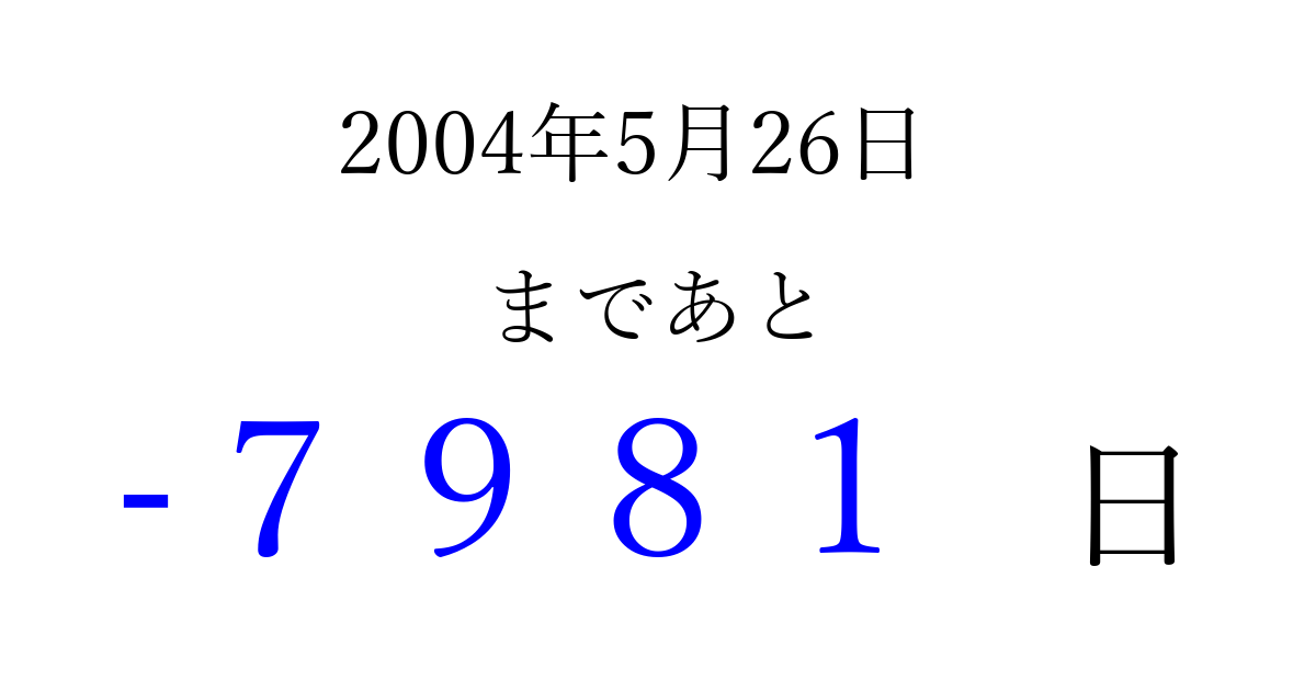 2004年5月26日(水)は もう 0000 日過ぎました 追加すると、トップページからすぐ選べるようになります ※2026/04/02現在の結果です。 最新の状態に更新する ↓シェアして、タイムライン上にカウントダウンを表示しよう!↓ 📤 この結果を共有する Tweet シェア Threads Bluesky 別の日付でカウントダウン 2004年5月のカレンダー このページをブックマークに追加すると、いつでもカウントダウンを確認できます。 (PC: Ctrl+D / Mac: ⌘+D) hitome-notes.comでは以下のページも運営しています。 指定日と期間から日付を計算 | ガチャ確率計算・シミュレーション | プライバシー・ポリシー 運営者:Avocado