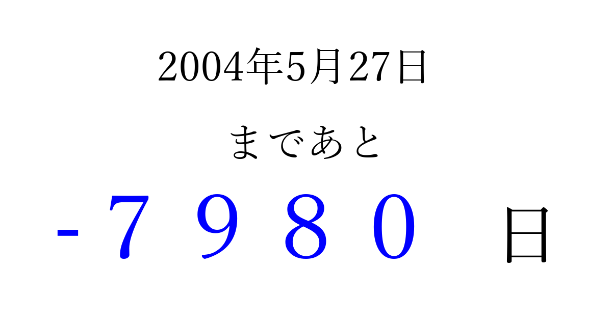 2004年5月27日(木)は もう 0000 日過ぎました 追加すると、トップページからすぐ選べるようになります ※2026/04/02現在の結果です。 最新の状態に更新する ↓シェアして、タイムライン上にカウントダウンを表示しよう!↓ 📤 この結果を共有する Tweet シェア Threads Bluesky 別の日付でカウントダウン 2004年5月のカレンダー このページをブックマークに追加すると、いつでもカウントダウンを確認できます。 (PC: Ctrl+D / Mac: ⌘+D) hitome-notes.comでは以下のページも運営しています。 指定日と期間から日付を計算 | ガチャ確率計算・シミュレーション | プライバシー・ポリシー 運営者:Avocado