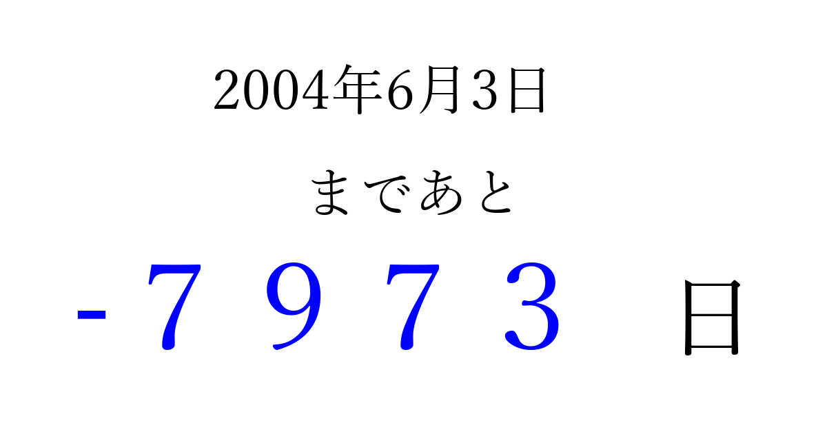 2004年6月3日(木)は もう 0000 日過ぎました 追加すると、トップページからすぐ選べるようになります ※2026/04/02現在の結果です。 最新の状態に更新する ↓シェアして、タイムライン上にカウントダウンを表示しよう!↓ 📤 この結果を共有する Tweet シェア Threads Bluesky 別の日付でカウントダウン 2004年6月のカレンダー このページをブックマークに追加すると、いつでもカウントダウンを確認できます。 (PC: Ctrl+D / Mac: ⌘+D) hitome-notes.comでは以下のページも運営しています。 指定日と期間から日付を計算 | ガチャ確率計算・シミュレーション | プライバシー・ポリシー 運営者:Avocado