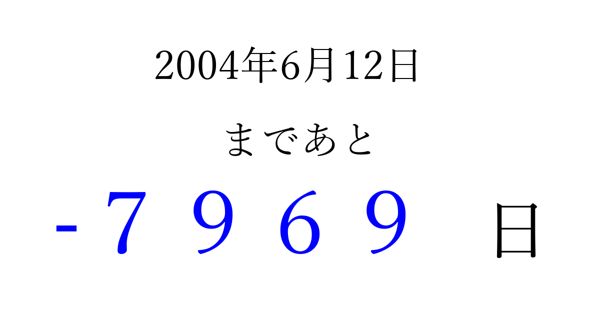 2004年6月12日(土)は もう 0000 日過ぎました 追加すると、トップページからすぐ選べるようになります ※2026/04/07現在の結果です。 最新の状態に更新する ↓シェアして、タイムライン上にカウントダウンを表示しよう!↓ 📤 この結果を共有する Tweet シェア Threads Bluesky 別の日付でカウントダウン 2004年6月のカレンダー このページをブックマークに追加すると、いつでもカウントダウンを確認できます。 (PC: Ctrl+D / Mac: ⌘+D) hitome-notes.comでは以下のページも運営しています。 指定日と期間から日付を計算 | ガチャ確率計算・シミュレーション | プライバシー・ポリシー 運営者:Avocado
