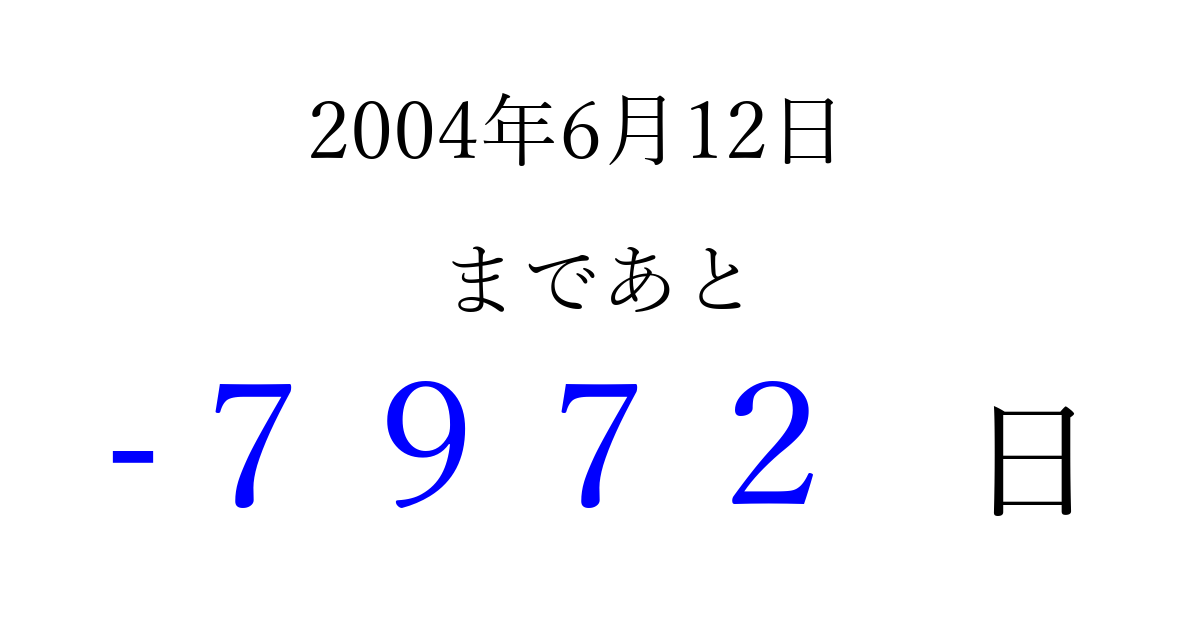 2004年6月12日(土)は もう 0000 日過ぎました 追加すると、トップページからすぐ選べるようになります ※2026/04/10現在の結果です。 最新の状態に更新する ↓シェアして、タイムライン上にカウントダウンを表示しよう!↓ 📤 この結果を共有する Tweet シェア Threads Bluesky 別の日付でカウントダウン 2004年6月のカレンダー このページをブックマークに追加すると、いつでもカウントダウンを確認できます。 (PC: Ctrl+D / Mac: ⌘+D) hitome-notes.comでは以下のページも運営しています。 指定日と期間から日付を計算 | ガチャ確率計算・シミュレーション | プライバシー・ポリシー 運営者:Avocado