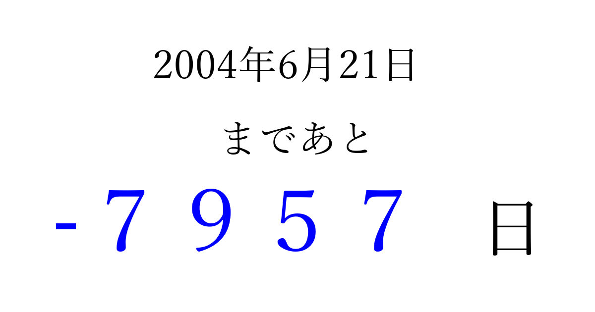 2004年6月21日(月)は もう 0000 日過ぎました 追加すると、トップページからすぐ選べるようになります ※2026/04/04現在の結果です。 最新の状態に更新する ↓シェアして、タイムライン上にカウントダウンを表示しよう!↓ 📤 この結果を共有する Tweet シェア Threads Bluesky 別の日付でカウントダウン 2004年6月のカレンダー このページをブックマークに追加すると、いつでもカウントダウンを確認できます。 (PC: Ctrl+D / Mac: ⌘+D) hitome-notes.comでは以下のページも運営しています。 指定日と期間から日付を計算 | ガチャ確率計算・シミュレーション | プライバシー・ポリシー 運営者:Avocado
