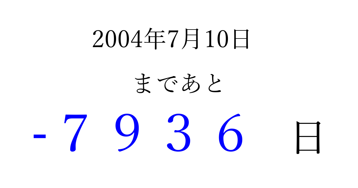 2004年7月10日(土)は もう 0000 日過ぎました 追加すると、トップページからすぐ選べるようになります ※2026/04/02現在の結果です。 最新の状態に更新する ↓シェアして、タイムライン上にカウントダウンを表示しよう!↓ 📤 この結果を共有する Tweet シェア Threads Bluesky 別の日付でカウントダウン 2004年7月のカレンダー このページをブックマークに追加すると、いつでもカウントダウンを確認できます。 (PC: Ctrl+D / Mac: ⌘+D) hitome-notes.comでは以下のページも運営しています。 指定日と期間から日付を計算 | ガチャ確率計算・シミュレーション | プライバシー・ポリシー 運営者:Avocado