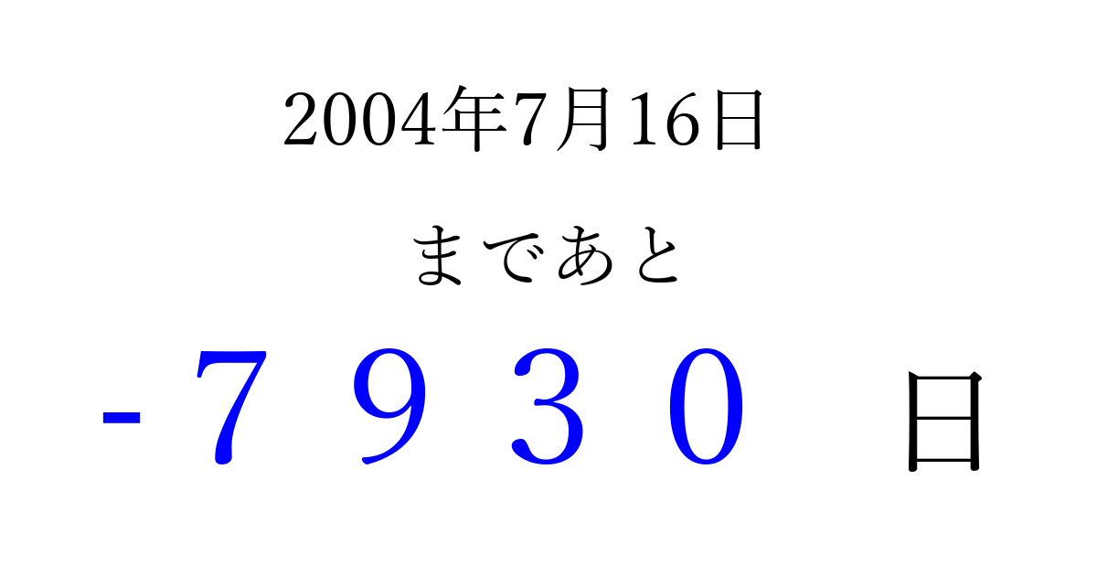 2004年7月16日(金)は もう 0000 日過ぎました 追加すると、トップページからすぐ選べるようになります ※2026/04/02現在の結果です。 最新の状態に更新する ↓シェアして、タイムライン上にカウントダウンを表示しよう!↓ 📤 この結果を共有する Tweet シェア Threads Bluesky 別の日付でカウントダウン 2004年7月のカレンダー このページをブックマークに追加すると、いつでもカウントダウンを確認できます。 (PC: Ctrl+D / Mac: ⌘+D) hitome-notes.comでは以下のページも運営しています。 指定日と期間から日付を計算 | ガチャ確率計算・シミュレーション | プライバシー・ポリシー 運営者:Avocado