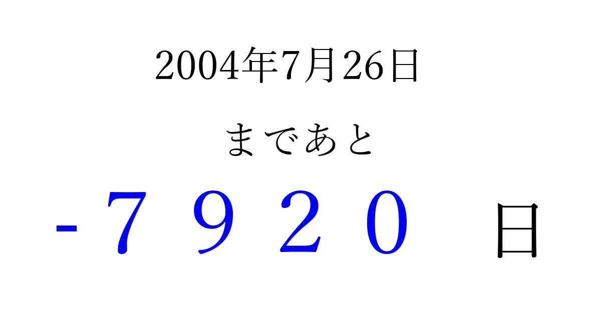 2004年7月26日(月)は もう 0000 日過ぎました 追加すると、トップページからすぐ選べるようになります ※2026/04/02現在の結果です。 最新の状態に更新する ↓シェアして、タイムライン上にカウントダウンを表示しよう!↓ 📤 この結果を共有する Tweet シェア Threads Bluesky 別の日付でカウントダウン 2004年7月のカレンダー このページをブックマークに追加すると、いつでもカウントダウンを確認できます。 (PC: Ctrl+D / Mac: ⌘+D) hitome-notes.comでは以下のページも運営しています。 指定日と期間から日付を計算 | ガチャ確率計算・シミュレーション | プライバシー・ポリシー 運営者:Avocado