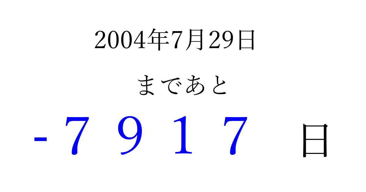 2004年7月29日(木)は もう 0000 日過ぎました 追加すると、トップページからすぐ選べるようになります ※2026/04/02現在の結果です。 最新の状態に更新する ↓シェアして、タイムライン上にカウントダウンを表示しよう!↓ 📤 この結果を共有する Tweet シェア Threads Bluesky 別の日付でカウントダウン 2004年7月のカレンダー このページをブックマークに追加すると、いつでもカウントダウンを確認できます。 (PC: Ctrl+D / Mac: ⌘+D) hitome-notes.comでは以下のページも運営しています。 指定日と期間から日付を計算 | ガチャ確率計算・シミュレーション | プライバシー・ポリシー 運営者:Avocado