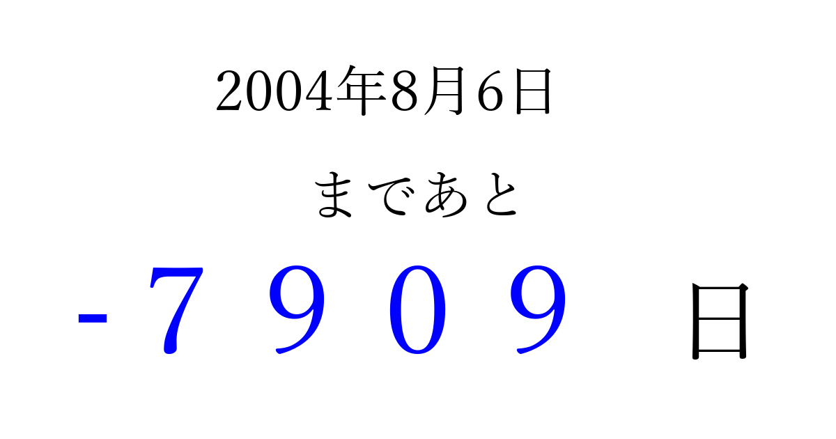 2004年8月6日(金)は もう 0000 日過ぎました 追加すると、トップページからすぐ選べるようになります ※2026/04/02現在の結果です。 最新の状態に更新する ↓シェアして、タイムライン上にカウントダウンを表示しよう!↓ 📤 この結果を共有する Tweet シェア Threads Bluesky 別の日付でカウントダウン 2004年8月のカレンダー このページをブックマークに追加すると、いつでもカウントダウンを確認できます。 (PC: Ctrl+D / Mac: ⌘+D) hitome-notes.comでは以下のページも運営しています。 指定日と期間から日付を計算 | ガチャ確率計算・シミュレーション | プライバシー・ポリシー 運営者:Avocado