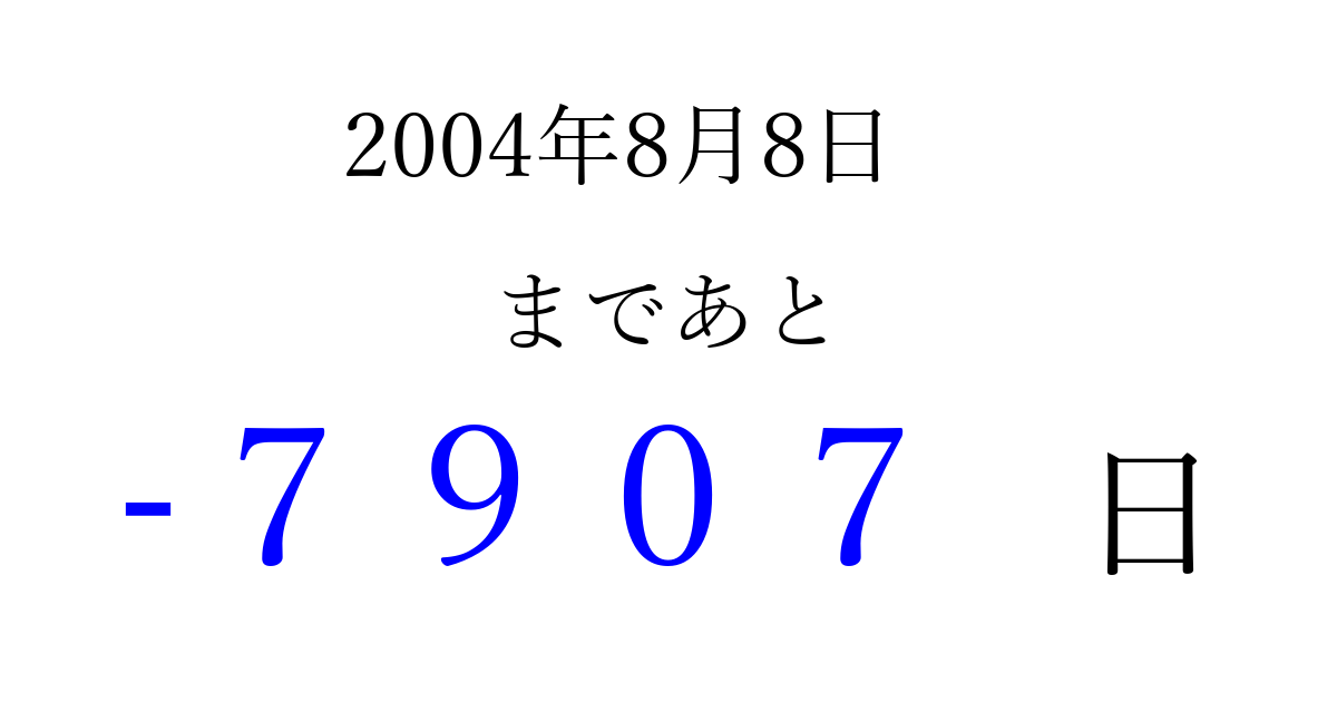 2004年8月8日(日)は もう 0000 日過ぎました 追加すると、トップページからすぐ選べるようになります ※2026/04/02現在の結果です。 最新の状態に更新する ↓シェアして、タイムライン上にカウントダウンを表示しよう!↓ 📤 この結果を共有する Tweet シェア Threads Bluesky 別の日付でカウントダウン 2004年8月のカレンダー このページをブックマークに追加すると、いつでもカウントダウンを確認できます。 (PC: Ctrl+D / Mac: ⌘+D) hitome-notes.comでは以下のページも運営しています。 指定日と期間から日付を計算 | ガチャ確率計算・シミュレーション | プライバシー・ポリシー 運営者:Avocado