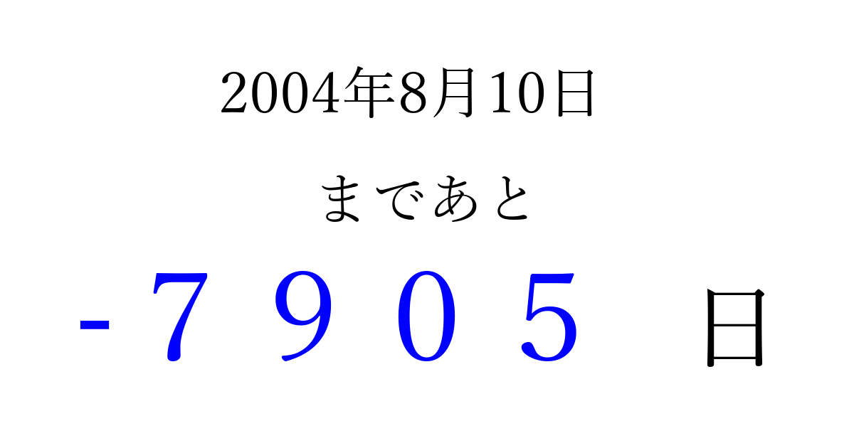 2004年8月10日(火)は もう 0000 日過ぎました 追加すると、トップページからすぐ選べるようになります ※2026/04/02現在の結果です。 最新の状態に更新する ↓シェアして、タイムライン上にカウントダウンを表示しよう!↓ 📤 この結果を共有する Tweet シェア Threads Bluesky 別の日付でカウントダウン 2004年8月のカレンダー このページをブックマークに追加すると、いつでもカウントダウンを確認できます。 (PC: Ctrl+D / Mac: ⌘+D) hitome-notes.comでは以下のページも運営しています。 指定日と期間から日付を計算 | ガチャ確率計算・シミュレーション | プライバシー・ポリシー 運営者:Avocado