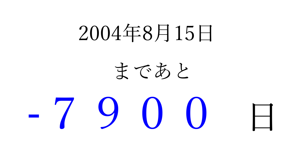 2004年8月15日(日)は もう 0000 日過ぎました 追加すると、トップページからすぐ選べるようになります ※2026/04/02現在の結果です。 最新の状態に更新する ↓シェアして、タイムライン上にカウントダウンを表示しよう!↓ 📤 この結果を共有する Tweet シェア Threads Bluesky 別の日付でカウントダウン 2004年8月のカレンダー このページをブックマークに追加すると、いつでもカウントダウンを確認できます。 (PC: Ctrl+D / Mac: ⌘+D) hitome-notes.comでは以下のページも運営しています。 指定日と期間から日付を計算 | ガチャ確率計算・シミュレーション | プライバシー・ポリシー 運営者:Avocado