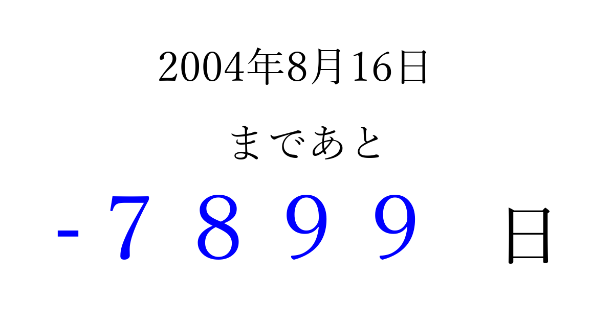 2004年8月16日(月)は もう 0000 日過ぎました 追加すると、トップページからすぐ選べるようになります ※2026/04/02現在の結果です。 最新の状態に更新する ↓シェアして、タイムライン上にカウントダウンを表示しよう!↓ 📤 この結果を共有する Tweet シェア Threads Bluesky 別の日付でカウントダウン 2004年8月のカレンダー このページをブックマークに追加すると、いつでもカウントダウンを確認できます。 (PC: Ctrl+D / Mac: ⌘+D) hitome-notes.comでは以下のページも運営しています。 指定日と期間から日付を計算 | ガチャ確率計算・シミュレーション | プライバシー・ポリシー 運営者:Avocado
