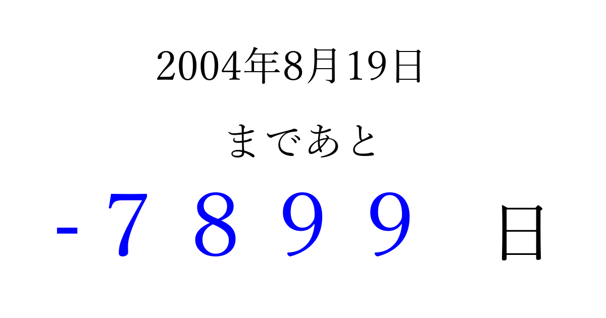 2004年8月19日(木)は もう 0000 日過ぎました 追加すると、トップページからすぐ選べるようになります ※2026/04/05現在の結果です。 最新の状態に更新する ↓シェアして、タイムライン上にカウントダウンを表示しよう!↓ 📤 この結果を共有する Tweet シェア Threads Bluesky 別の日付でカウントダウン 2004年8月のカレンダー このページをブックマークに追加すると、いつでもカウントダウンを確認できます。 (PC: Ctrl+D / Mac: ⌘+D) hitome-notes.comでは以下のページも運営しています。 指定日と期間から日付を計算 | ガチャ確率計算・シミュレーション | プライバシー・ポリシー 運営者:Avocado