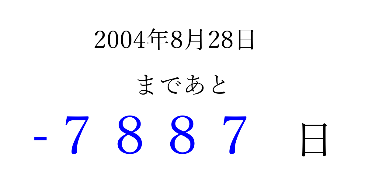 2004年8月28日(土)は もう 0000 日過ぎました 追加すると、トップページからすぐ選べるようになります ※2026/04/02現在の結果です。 最新の状態に更新する ↓シェアして、タイムライン上にカウントダウンを表示しよう!↓ 📤 この結果を共有する Tweet シェア Threads Bluesky 別の日付でカウントダウン 2004年8月のカレンダー このページをブックマークに追加すると、いつでもカウントダウンを確認できます。 (PC: Ctrl+D / Mac: ⌘+D) hitome-notes.comでは以下のページも運営しています。 指定日と期間から日付を計算 | ガチャ確率計算・シミュレーション | プライバシー・ポリシー 運営者:Avocado
