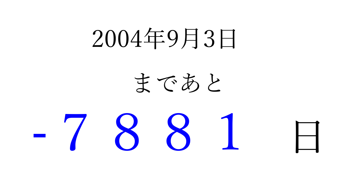 2004年9月3日(金)は もう 0000 日過ぎました 追加すると、トップページからすぐ選べるようになります ※2026/04/02現在の結果です。 最新の状態に更新する ↓シェアして、タイムライン上にカウントダウンを表示しよう!↓ 📤 この結果を共有する Tweet シェア Threads Bluesky 別の日付でカウントダウン 2004年9月のカレンダー このページをブックマークに追加すると、いつでもカウントダウンを確認できます。 (PC: Ctrl+D / Mac: ⌘+D) hitome-notes.comでは以下のページも運営しています。 指定日と期間から日付を計算 | ガチャ確率計算・シミュレーション | プライバシー・ポリシー 運営者:Avocado