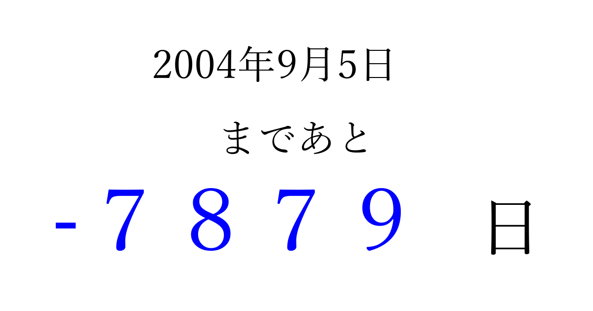 2004年9月5日(日)は もう 0000 日過ぎました 追加すると、トップページからすぐ選べるようになります ※2026/04/02現在の結果です。 最新の状態に更新する ↓シェアして、タイムライン上にカウントダウンを表示しよう!↓ 📤 この結果を共有する Tweet シェア Threads Bluesky 別の日付でカウントダウン 2004年9月のカレンダー このページをブックマークに追加すると、いつでもカウントダウンを確認できます。 (PC: Ctrl+D / Mac: ⌘+D) hitome-notes.comでは以下のページも運営しています。 指定日と期間から日付を計算 | ガチャ確率計算・シミュレーション | プライバシー・ポリシー 運営者:Avocado
