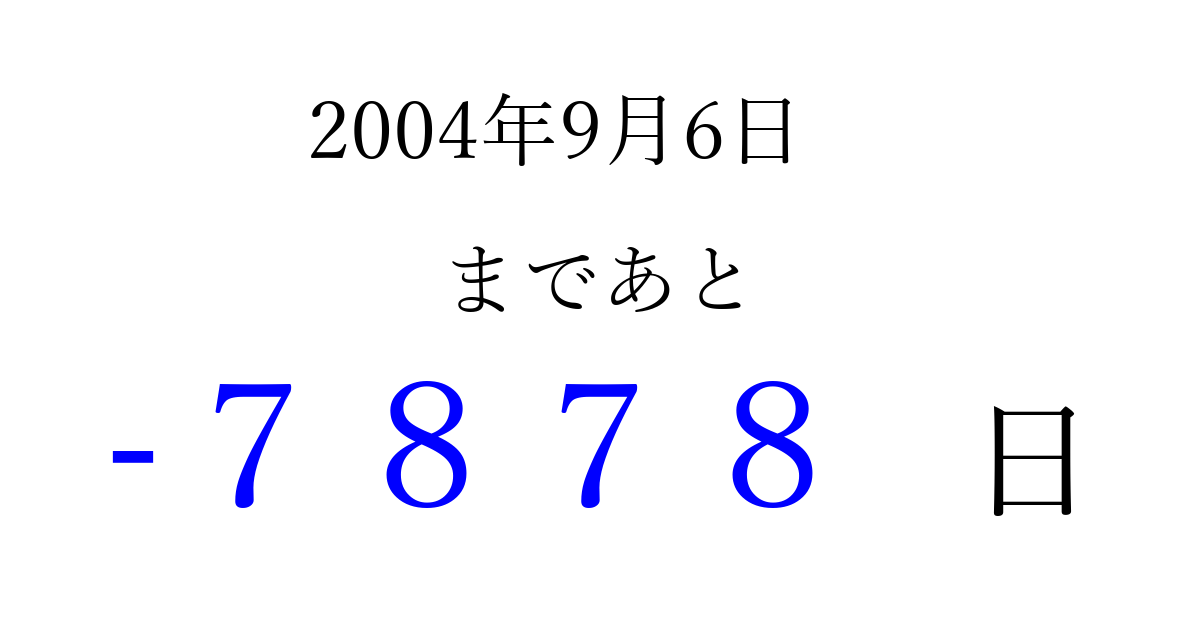 2004年9月6日(月)は もう 0000 日過ぎました 追加すると、トップページからすぐ選べるようになります ※2026/04/02現在の結果です。 最新の状態に更新する ↓シェアして、タイムライン上にカウントダウンを表示しよう!↓ 📤 この結果を共有する Tweet シェア Threads Bluesky 別の日付でカウントダウン 2004年9月のカレンダー このページをブックマークに追加すると、いつでもカウントダウンを確認できます。 (PC: Ctrl+D / Mac: ⌘+D) hitome-notes.comでは以下のページも運営しています。 指定日と期間から日付を計算 | ガチャ確率計算・シミュレーション | プライバシー・ポリシー 運営者:Avocado